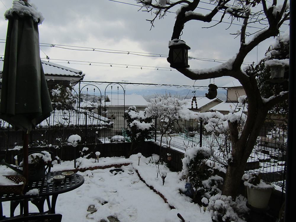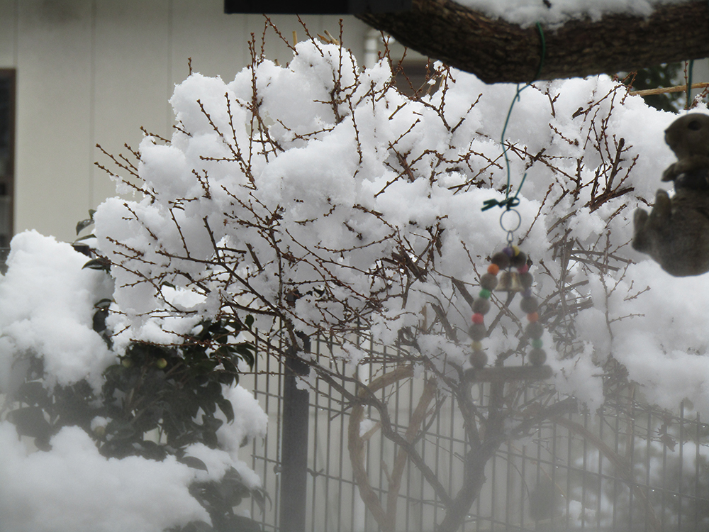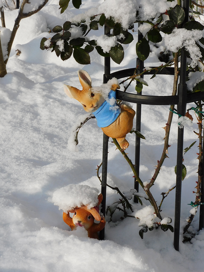 - 朝になって見る銀世界**。多分・朝方降るのでしょうね。夜中は降っていませんが・・?かなりの積雪です。ウサギさんも埋もれています。