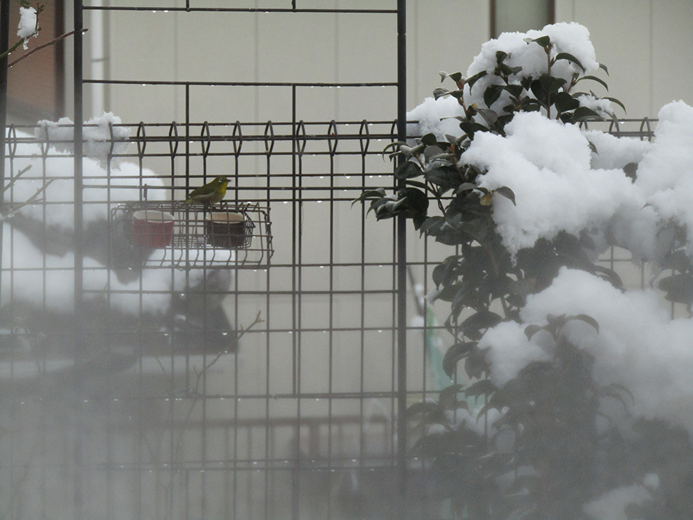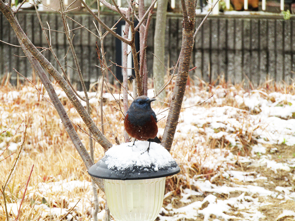 - 雪の朝 一番にイソヒヨくんが来てくれました。周りは銀世界です。