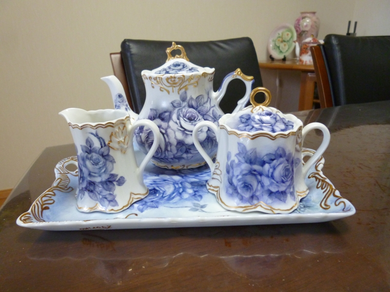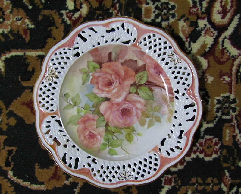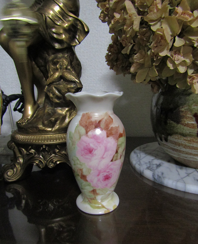 - 高さ15cmの小さい花瓶にバラの絵付けをしています一回焼成した所です。& ドレッシープレートにもバラの絵付けをしています。2度目の焼成前です。焼くと色が変わると思います。