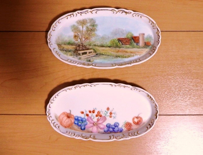 高さ15cmの小さい花瓶にバラの絵付けをしています一回焼成した所です。& ドレッシープレートにもバラの絵付けをしています。2度目の焼成前です。焼くと色が変わると思います。