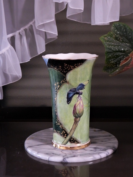 - 高さ15cmの小さい花瓶にバラの絵付けをしています一回焼成した所です。& ドレッシープレートにもバラの絵付けをしています。2度目の焼成前です。焼くと色が変わると思います。