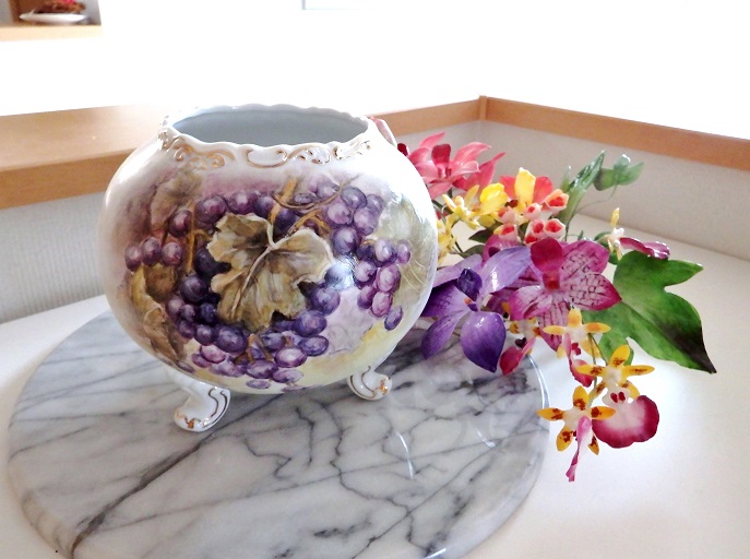 • 高さ15cmの小さい花瓶にバラの絵付けをしています一回焼成した所です。& ドレッシープレートにもバラの絵付けをしています。2度目の焼成前です。焼くと色が変わると思います。