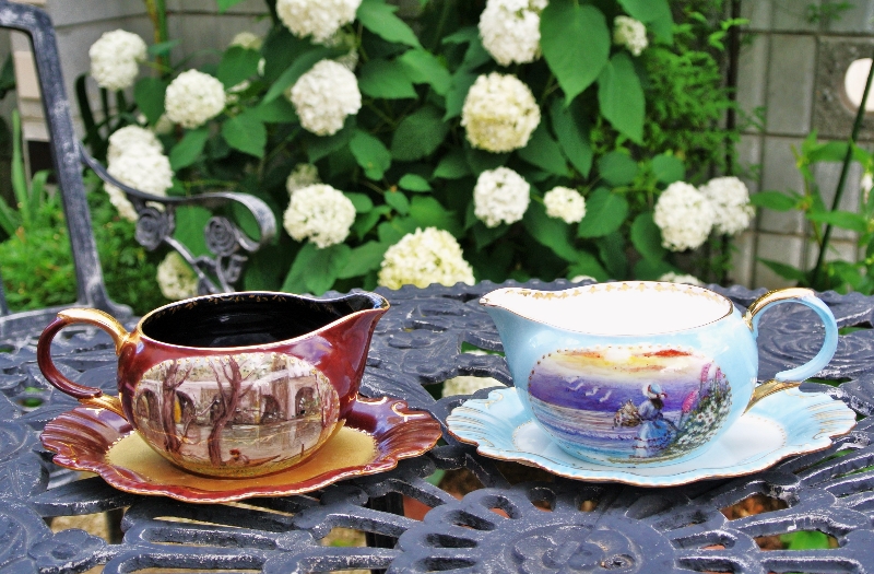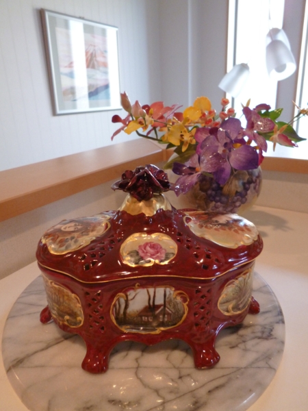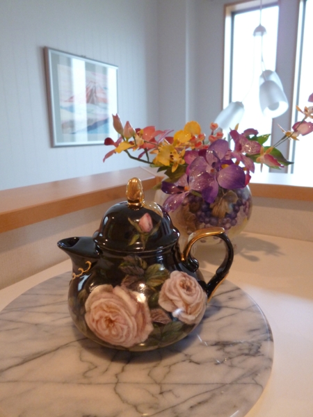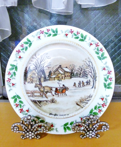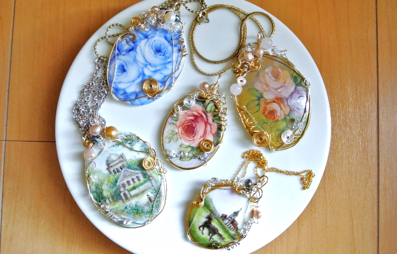 - 高さ15cmの小さい花瓶にバラの絵付けをしています一回焼成した所です。& ドレッシープレートにもバラの絵付けをしています。2度目の焼成前です。焼くと色が変わると思います。