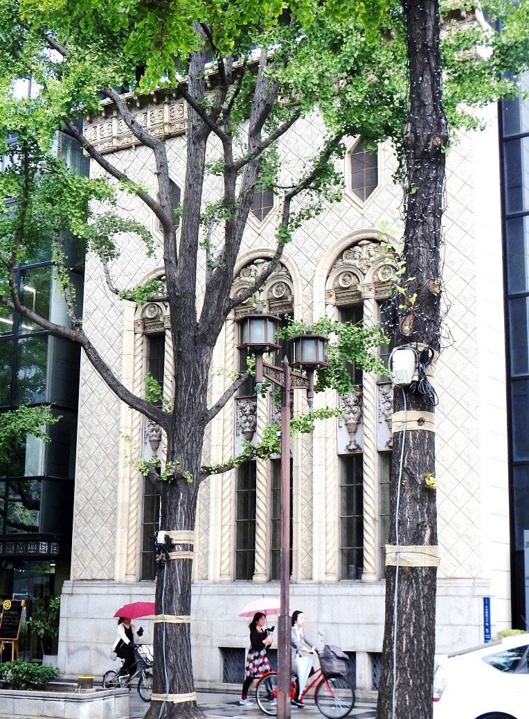 まだ緑色のイチョウと凝った装飾の建物……美しいですね。