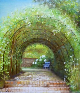 いっぱいいっぱいに咲き誇った白い花のアーチ、その先のブルーのベンチが際立っています。 その横に咲いている白いアナベルですか、それと合わさってすごく印象的な作品です!