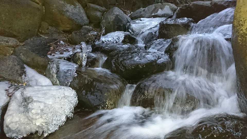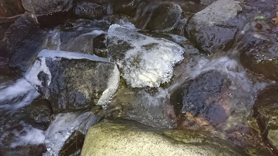 水辺の石の上の氷綺麗ですね。日が当たるとキラキラして