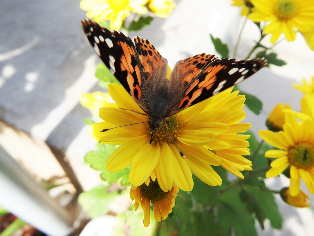朝の光の中黄色の花とオレンジの蝶々