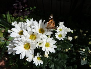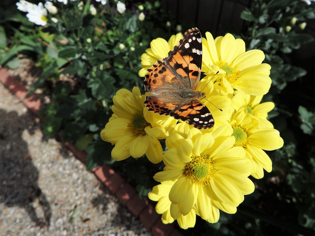 見ると菊に止まってカメラを近づけても逃げなくて