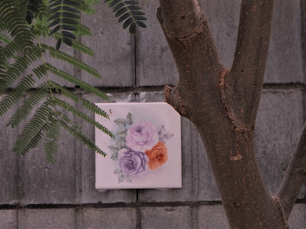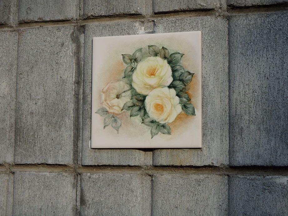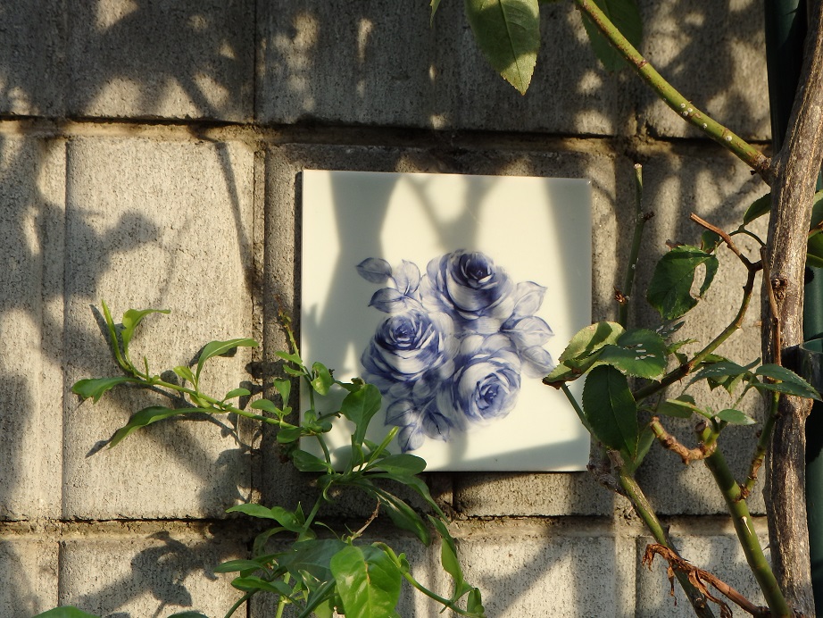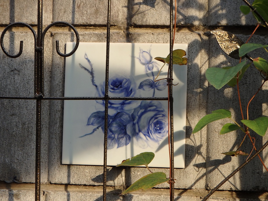 今年も庭の葉が少なくなって塀のタイルに描いたバラが浮いてくる季節になりました。やっぱりブル-のバラが好きです。
