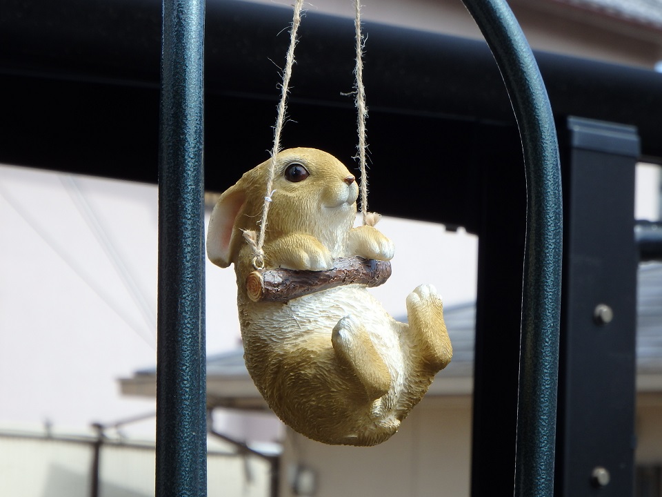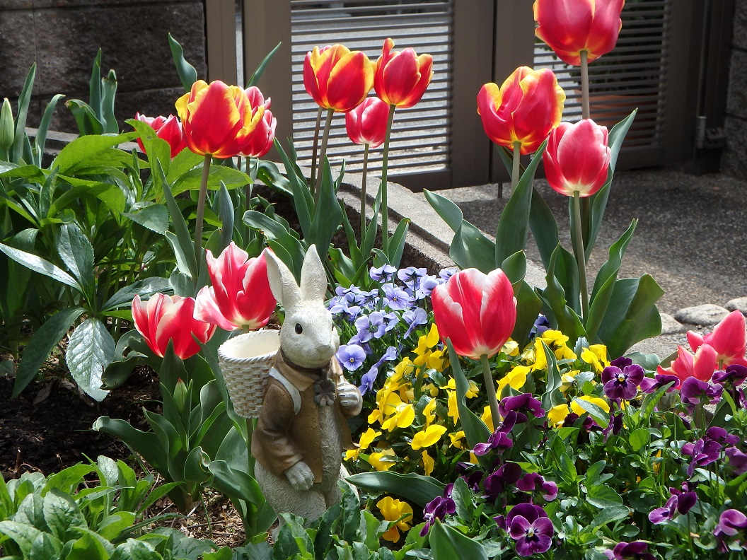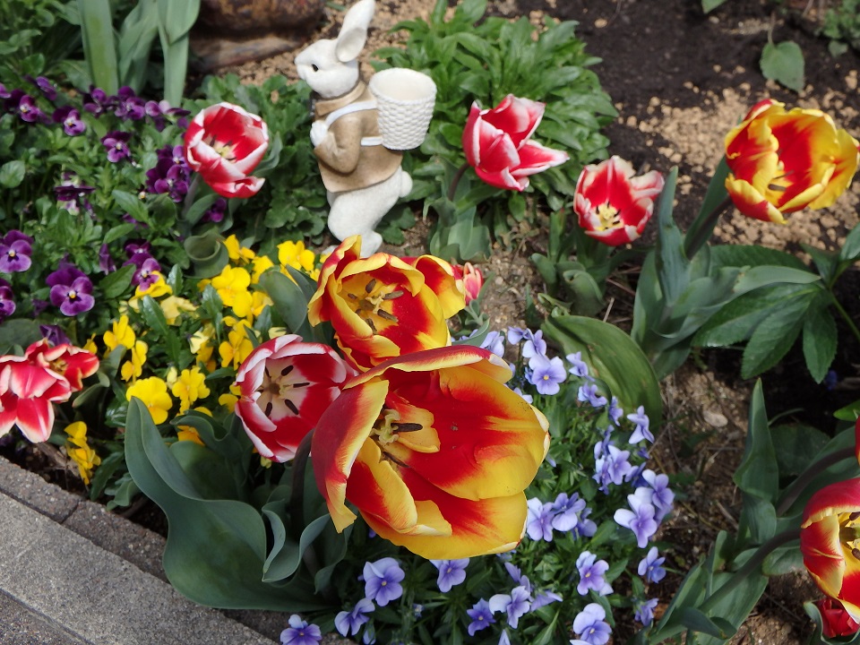 庭のチュ-リップと兎さんのオ-ナメント**可愛くなりました。ブランコの兎さんは赤いバラが咲くのを待っています。