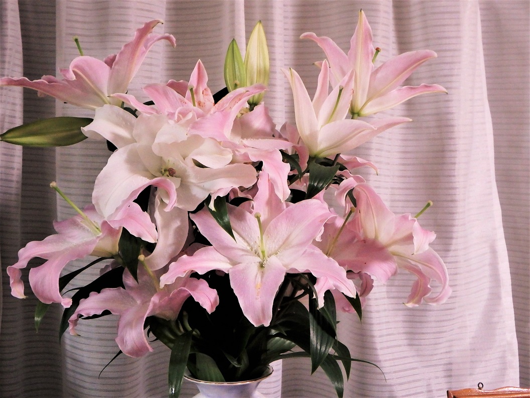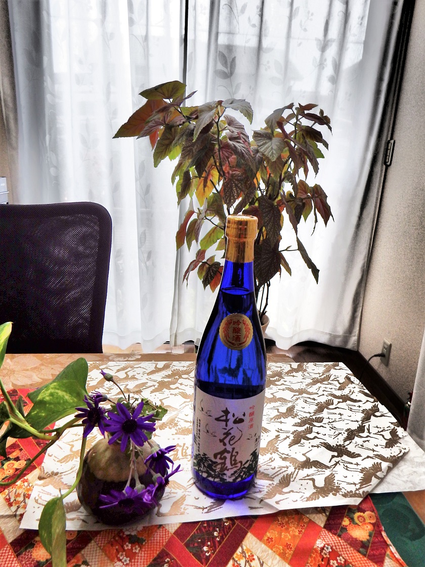 母の日**いい香りの百合の花&葛井寺近くの藤本酒造さんの松花鶴を頂きました。とても嬉しいです。ありがとう。**庭では何とかバラ・ピエ-ルドゥロンサールが一輪咲きました。
