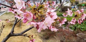 サクラはたぶん河津桜かな?昨夜は嵐でしたが雪は積もって