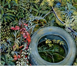 色とりどりの植物たちの中に、古タイヤ…… でもこの絵は、植物たちが負けないぞと、言っている様です。