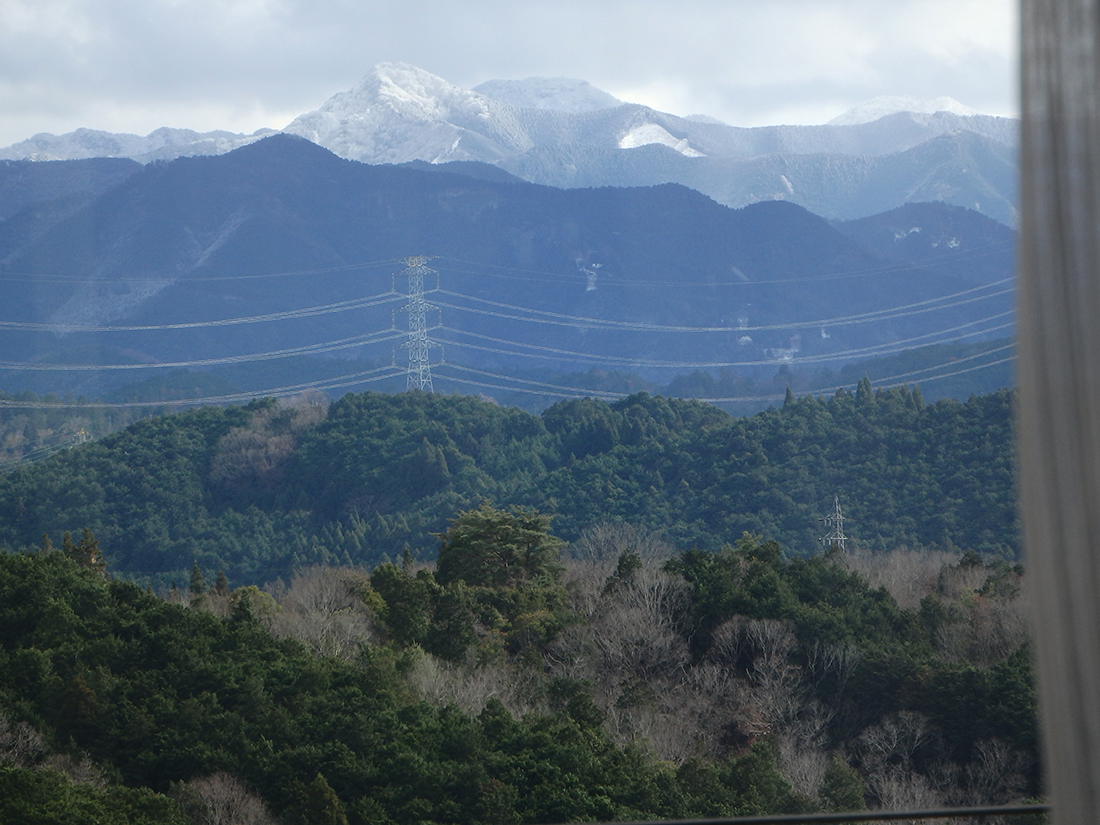 昨日雪がやんで吉野大峰山脈が見えると峰々に雪が残っていて綺麗でした。アトリエの窓から撮っています。大天井ケ岳に雪が綺麗に残ります。隣の台形の白い山が山上ケ岳で大峰山寺があリます。望遠鏡で見えます。