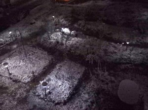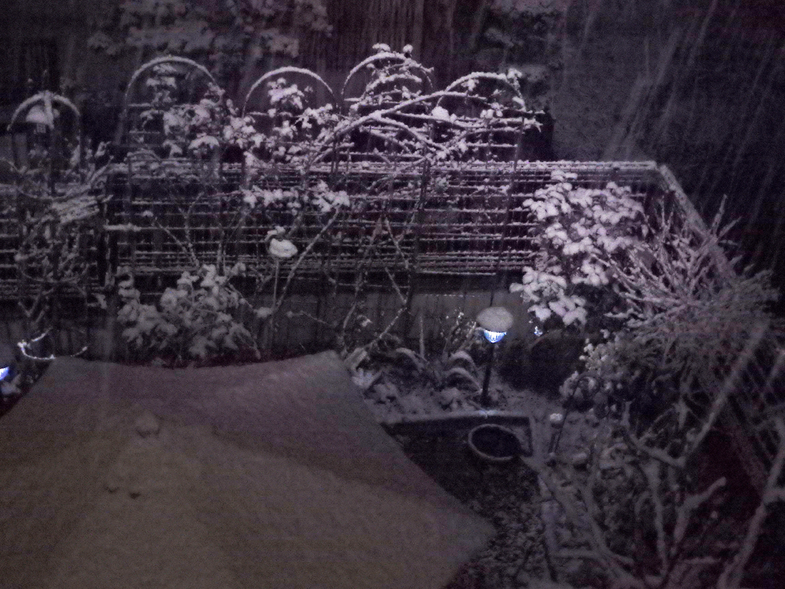 - 朝になって見る銀世界**。多分・朝方降るのでしょうね。夜中は降っていませんが・・?かなりの積雪です。ウサギさんも埋もれています。