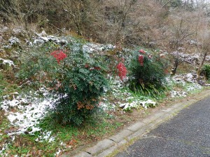赤い南天は早朝なら本当に日本画の雪南天のように