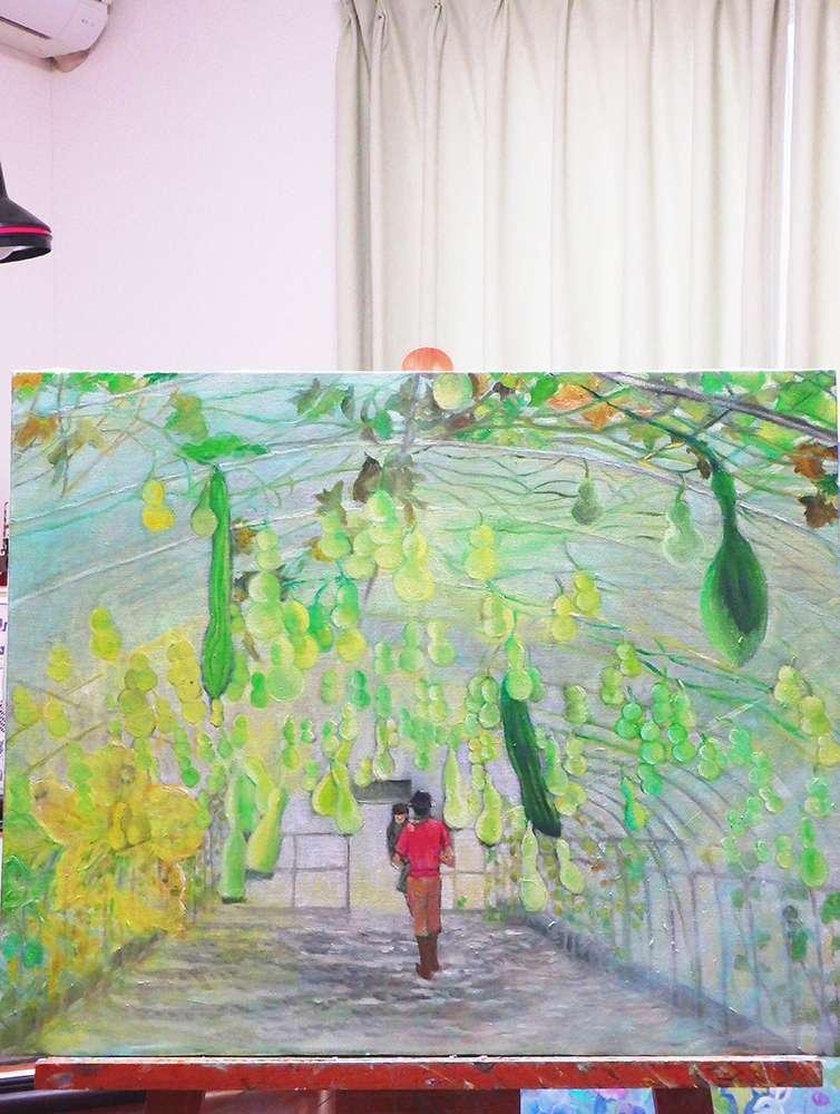 ヘチマと瓢箪がいっぱいの絵を描いています。穂高と旅人の絵と同じ頃から描いていますが難しいので完成まで長い時間かかりそうです。どのようになるか未定です。?