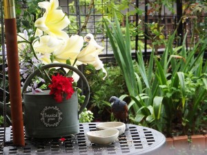 ジョウロの中でも部屋の中でも、華やかに咲き誇っていますね!