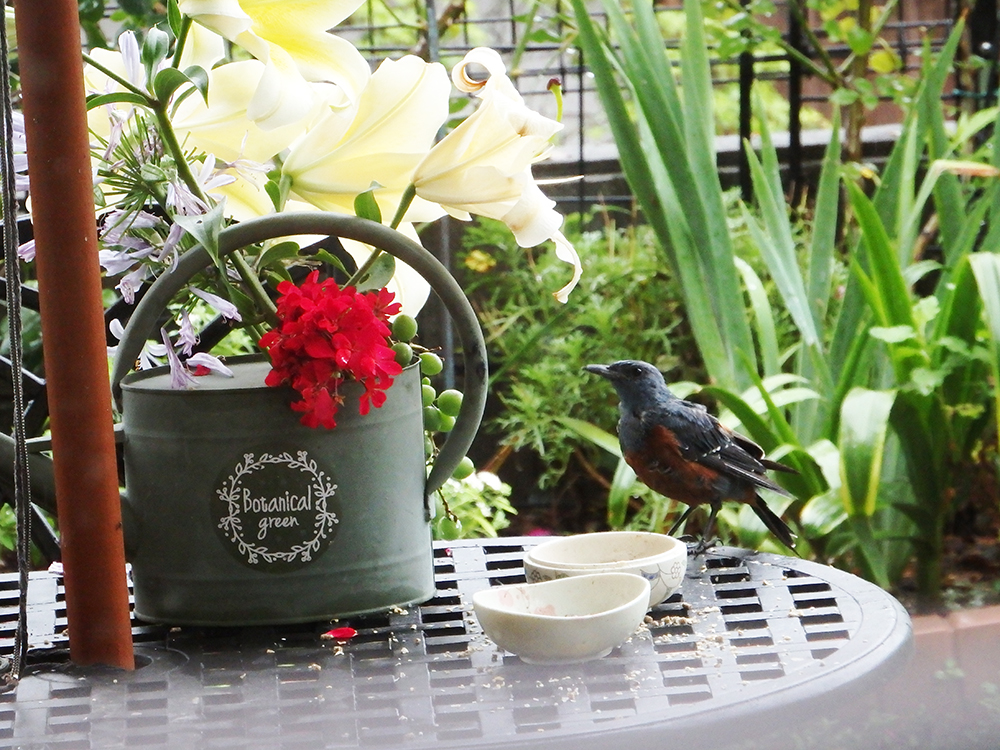 - 雪の朝 一番にイソヒヨくんが来てくれました。周りは銀世界です。