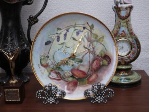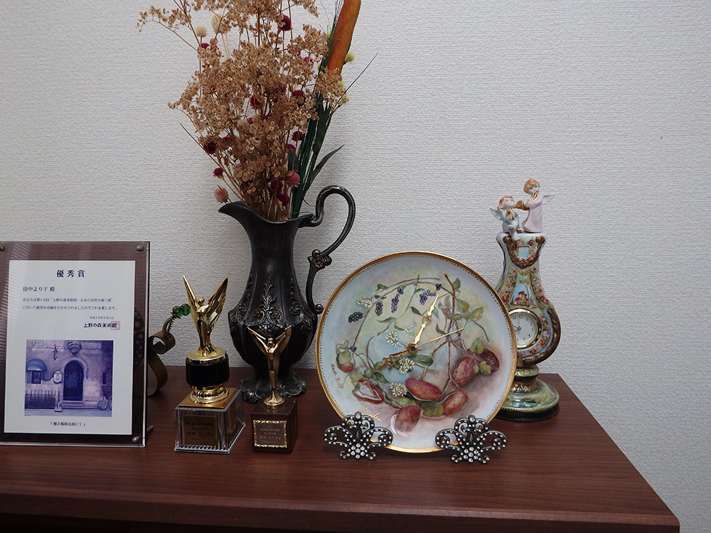- 高さ15cmの小さい花瓶にバラの絵付けをしています一回焼成した所です。& ドレッシープレートにもバラの絵付けをしています。2度目の焼成前です。焼くと色が変わると思います。