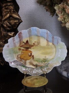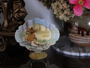 - 高さ15cmの小さい花瓶にバラの絵付けをしています一回焼成した所です。& ドレッシープレートにもバラの絵付けをしています。2度目の焼成前です。焼くと色が変わると思います。