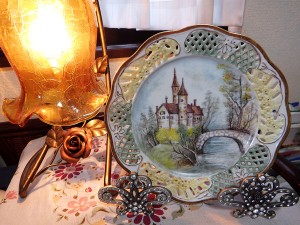 - 高さ15cmの小さい花瓶にバラの絵付けをしています一回焼成した所です。& ドレッシープレートにもバラの絵付けをしています。2度目の焼成前です。焼くと色が変わると思います。