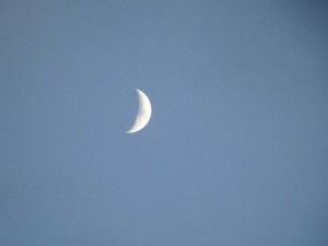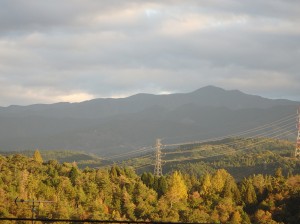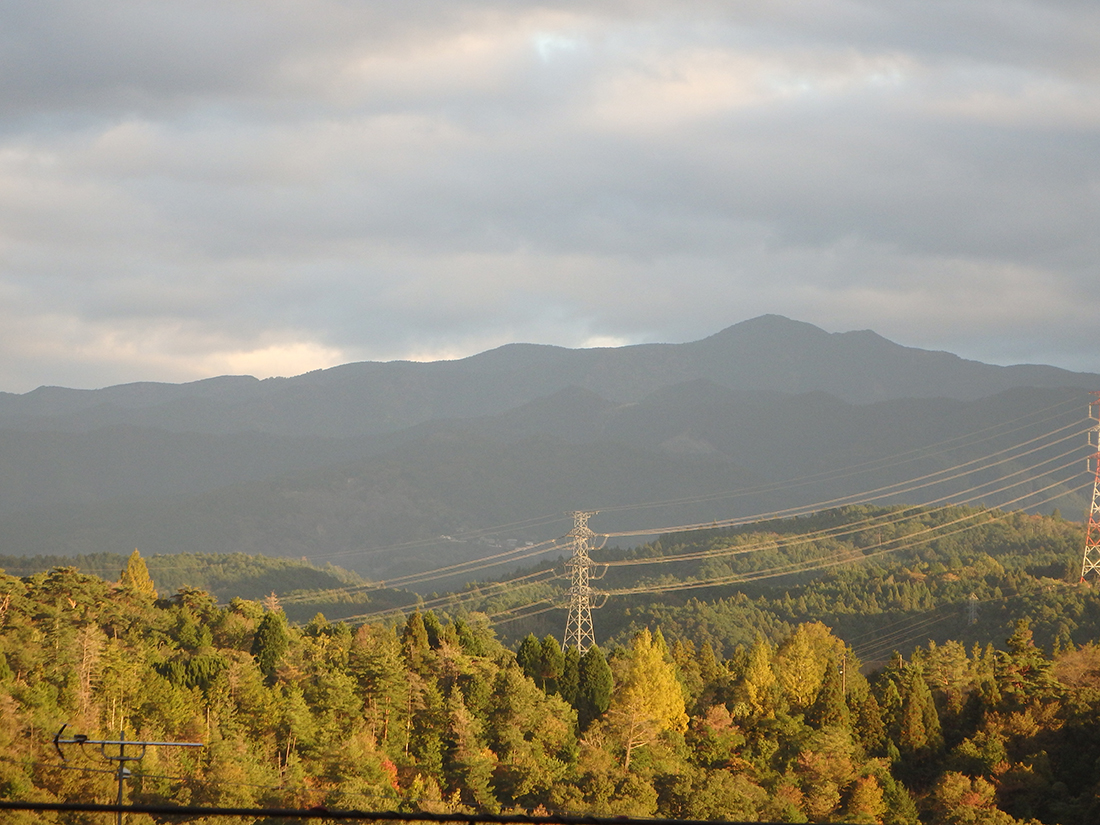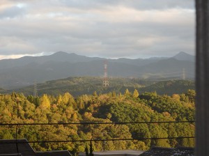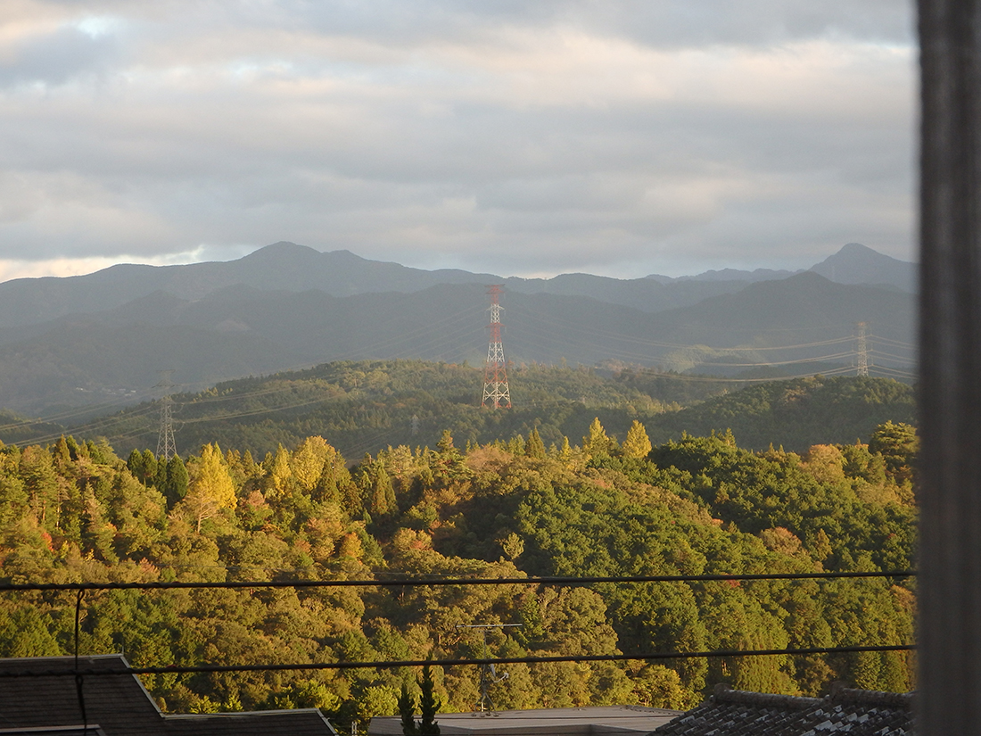 夕陽を浴びた吉野山・まだ紅葉は進んでいませんがメタセコイアは黄色くなって浮かび上がり綺麗です。ふと見ると月も静かに昇っていました。(アトリエの正面の風景です。)