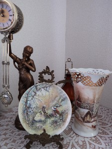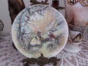 - 高さ15cmの小さい花瓶にバラの絵付けをしています一回焼成した所です。& ドレッシープレートにもバラの絵付けをしています。2度目の焼成前です。焼くと色が変わると思います。