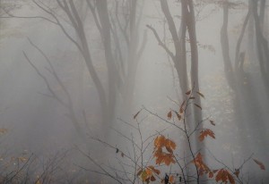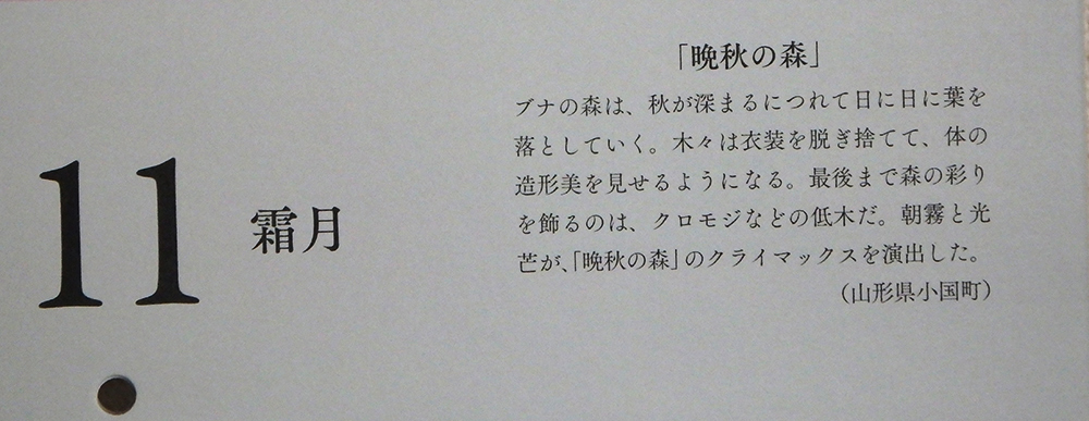 写真家・鈴木一雄先生 花こよみ 11月 晩秋の森 山形県小国町のブナの森 朝霧と光芒にうっすらと浮かぶ木々の葉を落とした姿が美しく低木の紅葉が慎ましい色で本当に素敵です。いつもながら先生の文章で光景が目に浮かびます。今までで一番好きなお写真です。有難うございます。