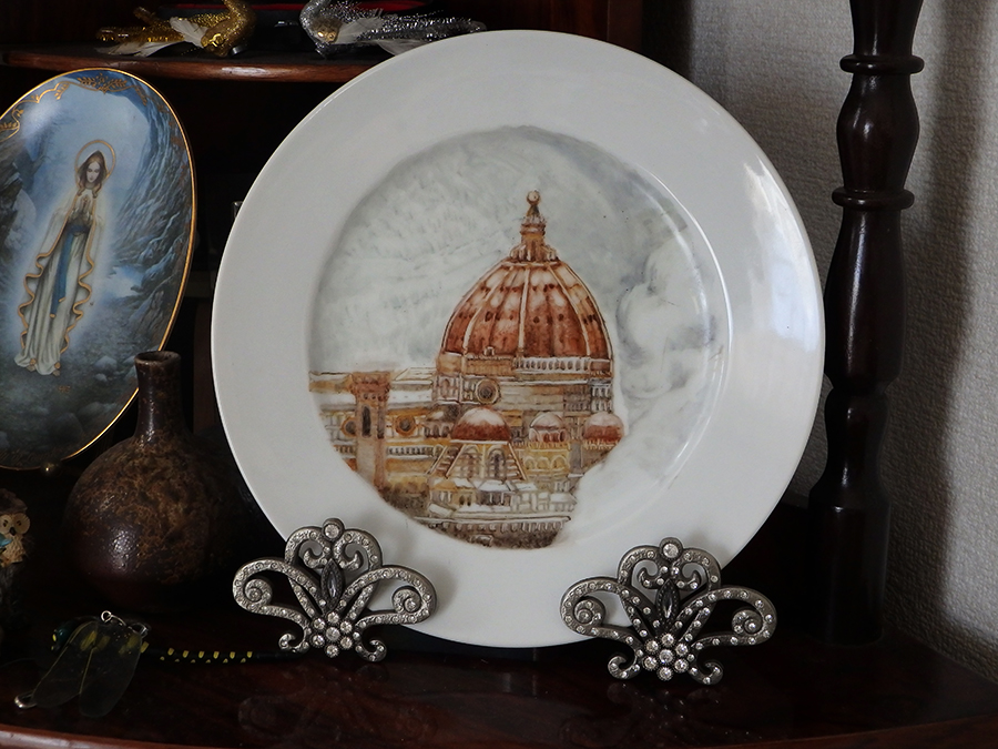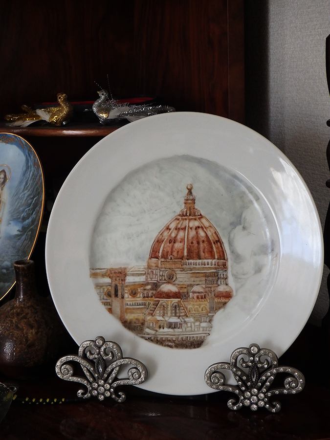- 高さ15cmの小さい花瓶にバラの絵付けをしています一回焼成した所です。& ドレッシープレートにもバラの絵付けをしています。2度目の焼成前です。焼くと色が変わると思います。
