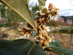 枇杷の花咲く頃・・。前方の山が雪で白くなる頃咲き始める枇杷・常緑の葉と厳冬に咲く白い花の心意気素敵です。実と葉は案外絵になりますし**。