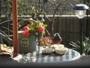 - 雪の朝 一番にイソヒヨくんが来てくれました。周りは銀世界です。