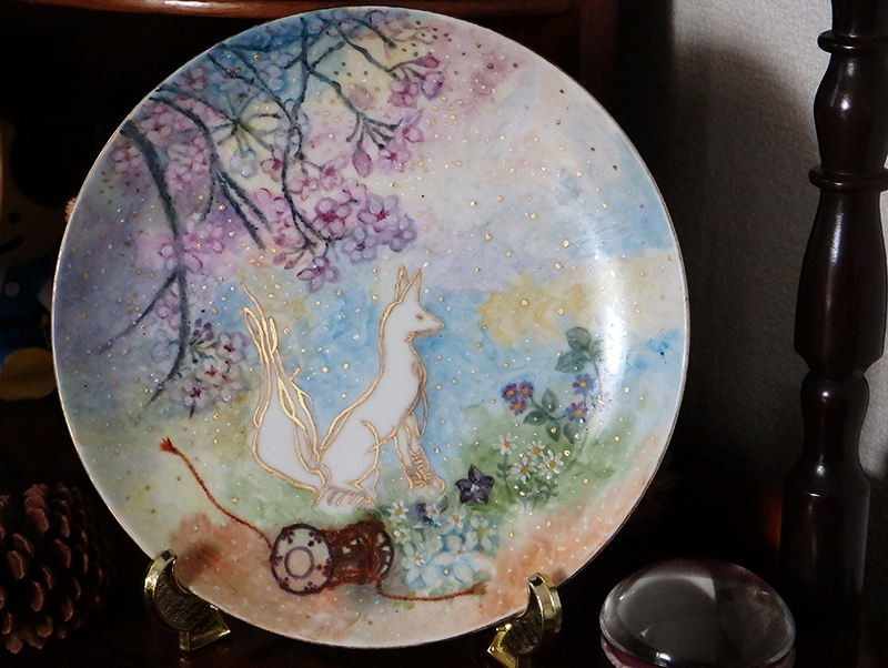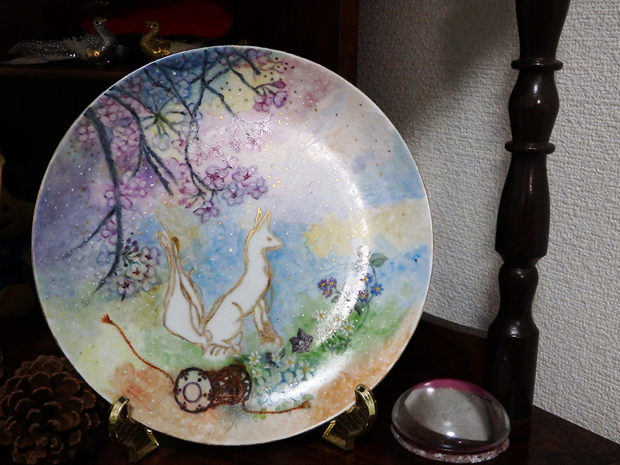- 高さ15cmの小さい花瓶にバラの絵付けをしています一回焼成した所です。& ドレッシープレートにもバラの絵付けをしています。2度目の焼成前です。焼くと色が変わると思います。