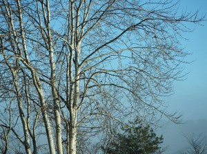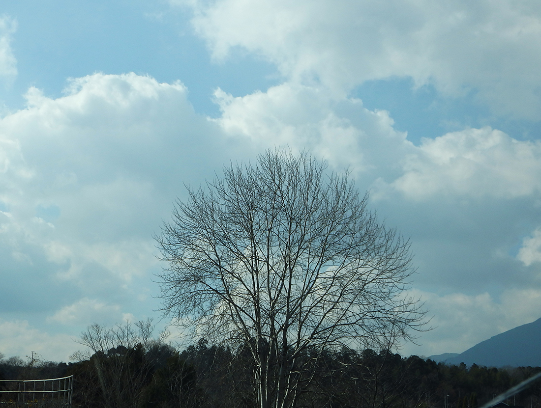 今朝は一面の霧の中・・。福神の方の病院に行きましたが帰りは霧も晴れいつも楽しみに見ている欅も葉を落とし白樺のように綺麗になっていました。雲もふんわりと春のようでした。