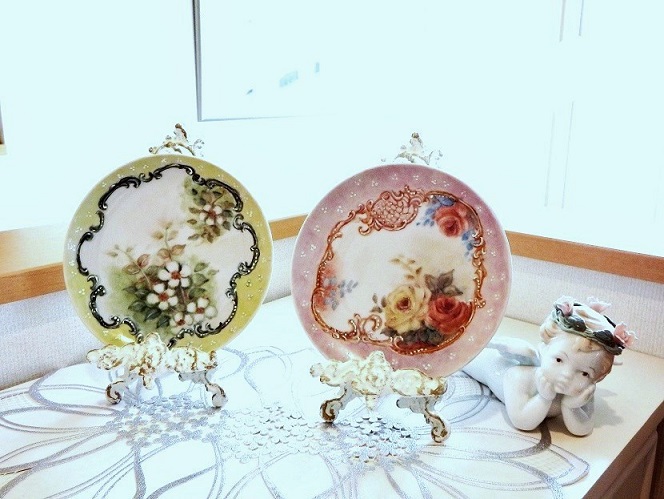 - 高さ15cmの小さい花瓶にバラの絵付けをしています一回焼成した所です。& ドレッシープレートにもバラの絵付けをしています。2度目の焼成前です。焼くと色が変わると思います。