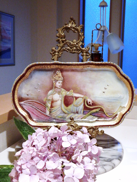 - 高さ15cmの小さい花瓶にバラの絵付けをしています一回焼成した所です。& ドレッシープレートにもバラの絵付けをしています。2度目の焼成前です。焼くと色が変わると思います。