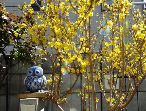 毎日・ヒヨ鳥がレンギョウの花を食べに来るので、CDみたいな鳥よけをつけました。