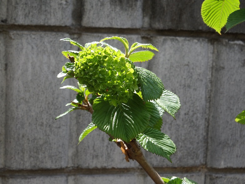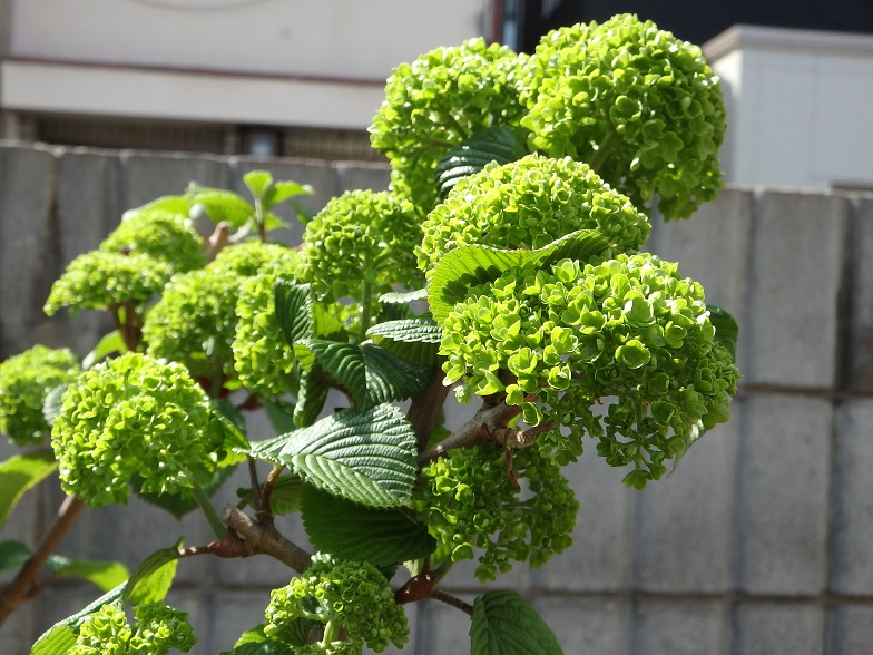 遠縁のお家のオオデマリが素敵な色で・・石垣とよく合いました。