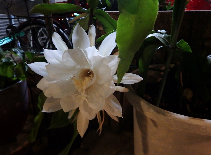 ハイ・ウットリします。綺麗~~~。夜中の12時ごろ玄関先に出ると 咲いていました。可哀そうに寂しそうに・・・。